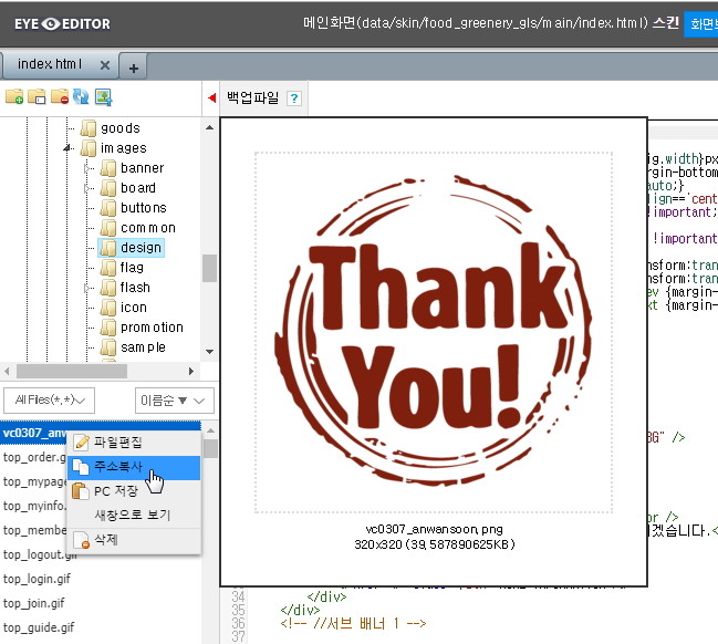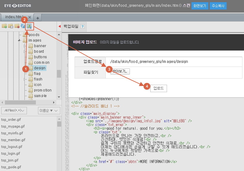 퍼스트몰의 EYE Editor를 통하여 이미지 등록을 하실 수 있습니다.
